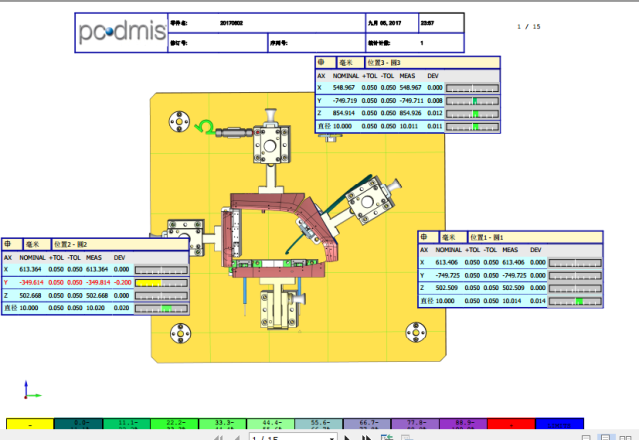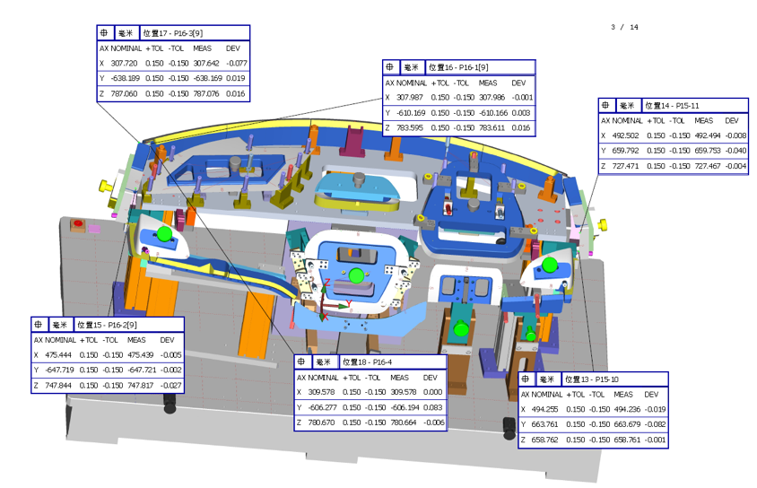 檢具作為控制和評價產(chǎn)品尺寸、形狀、位置特性的專用工具,其正確合理的定位是準確測量的基礎。因此,檢具從組裝開始需要借助三坐標將位置數(shù)據(jù)量化,調試完成后通常需要附三坐標報告一起出貨。