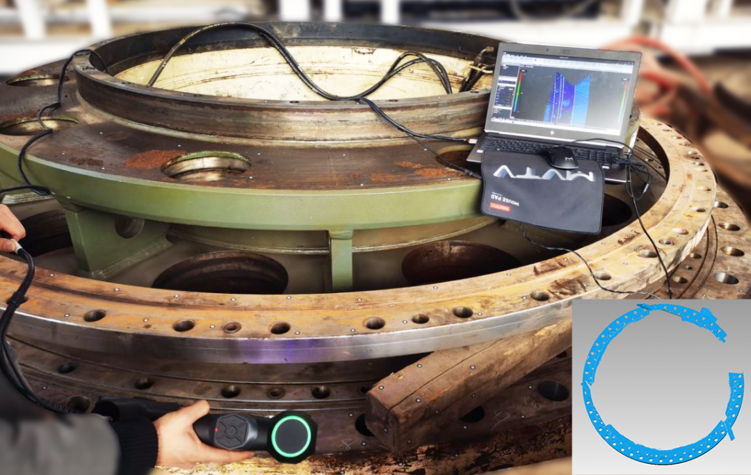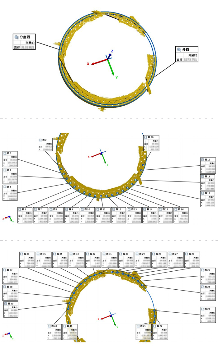 客戶為西南某制造企業(yè),有一圓柱形工件(直徑3m),因已使用一定年限而有所磨損,客戶需要采集該工件數(shù)據(jù),獲取外徑、所有孔位尺寸及小孔分度圓等關(guān)鍵尺寸,判斷偏差是否在容差范圍內(nèi),同時(shí)用于安裝在該工件上的配套工件的逆向設(shè)計(jì)。