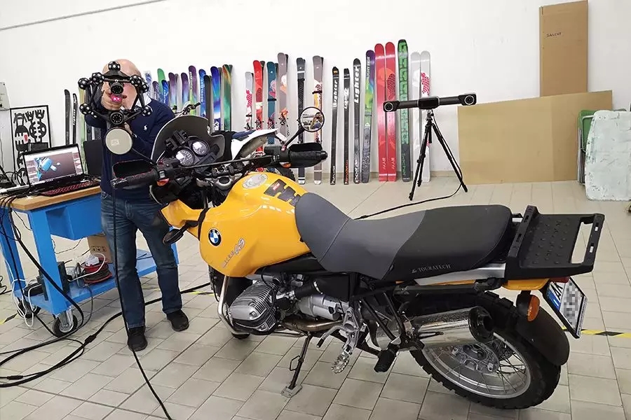 本次寶馬摩托車三維掃描使用的是Hyperscan Ultra 智能光學追蹤3D掃描儀,Hyperscan Ultra 智能光學追蹤3D掃描儀采用13對大范圍十字交叉掃描激光束+1條深孔掃描激光束的激光器配置,測量速度達到1,340,000次/秒。標配全新的320萬像素的進口工業相機,分辨率達到0.03mm,精度最高達到0.03mm、最大單幅掃描范圍為440×620mm。