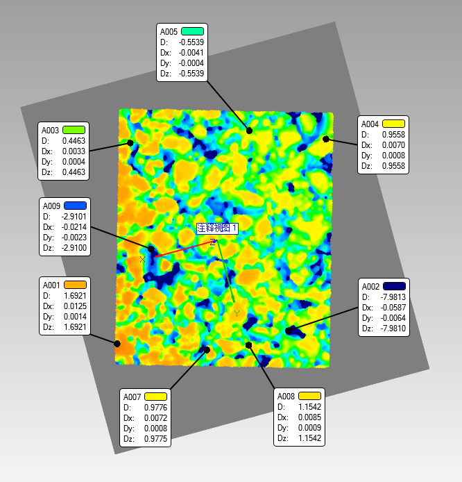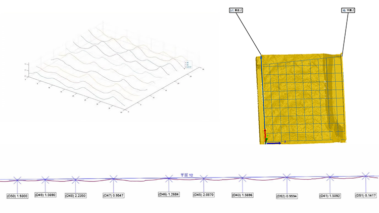 ◎掃描輸出的三維模型直接導(dǎo)入到Geomagic Control檢測軟件中進(jìn)行分析,圖中是以一個(gè)水平面為參考,計(jì)算出的最大上偏差及最大下偏差,可以由此分析路面的形貌高差。