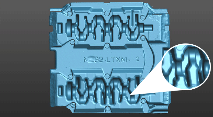 曲軸模具因其異型、型腔窄且深,對傳統(tǒng)檢測手段而言一直都是難點。即便是采用某些三維掃描儀,也會出現(xiàn)掃描數(shù)據缺面,部分死角掃描不到的情況。