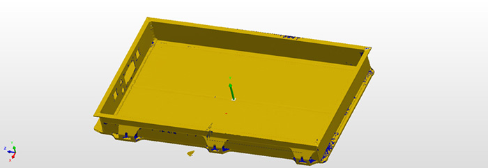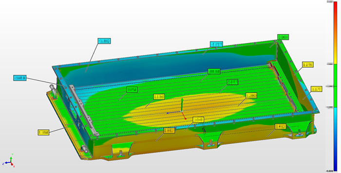 電池底板孔位及外型尺寸,掃描耗時5分鐘,完成數據檢測及報告,耗時10分鐘,并且掃描作業及檢測過程可實現自動化,一鍵可完成自動化出檢測報告。